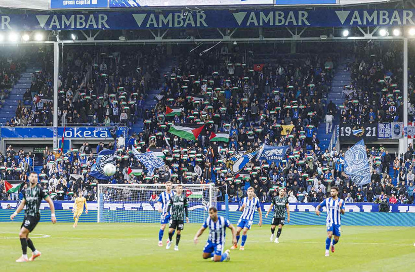 Deportivo Alaves taraftarları, maç sırasında Filistin’e destek vermek amacıyla pankart açtı.